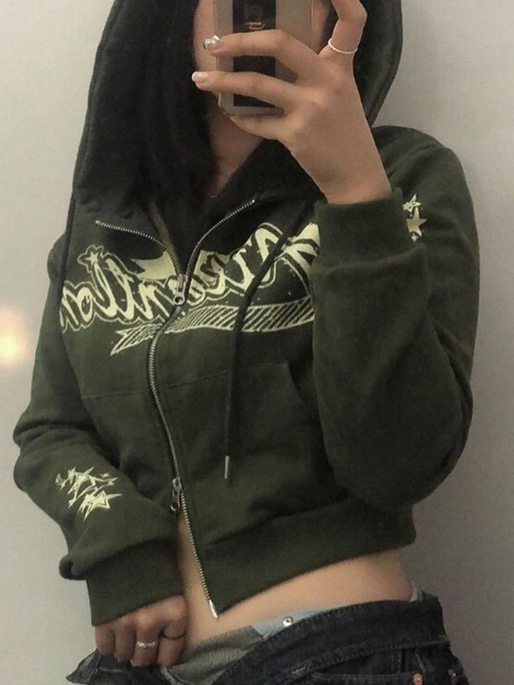 Hoodie corta con cierre frontal, capucha ajustable y estampado estilo graffiti con estrellas.